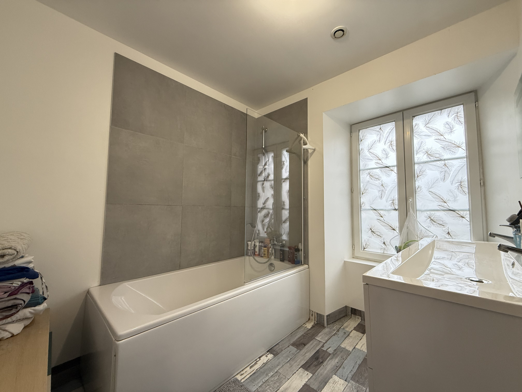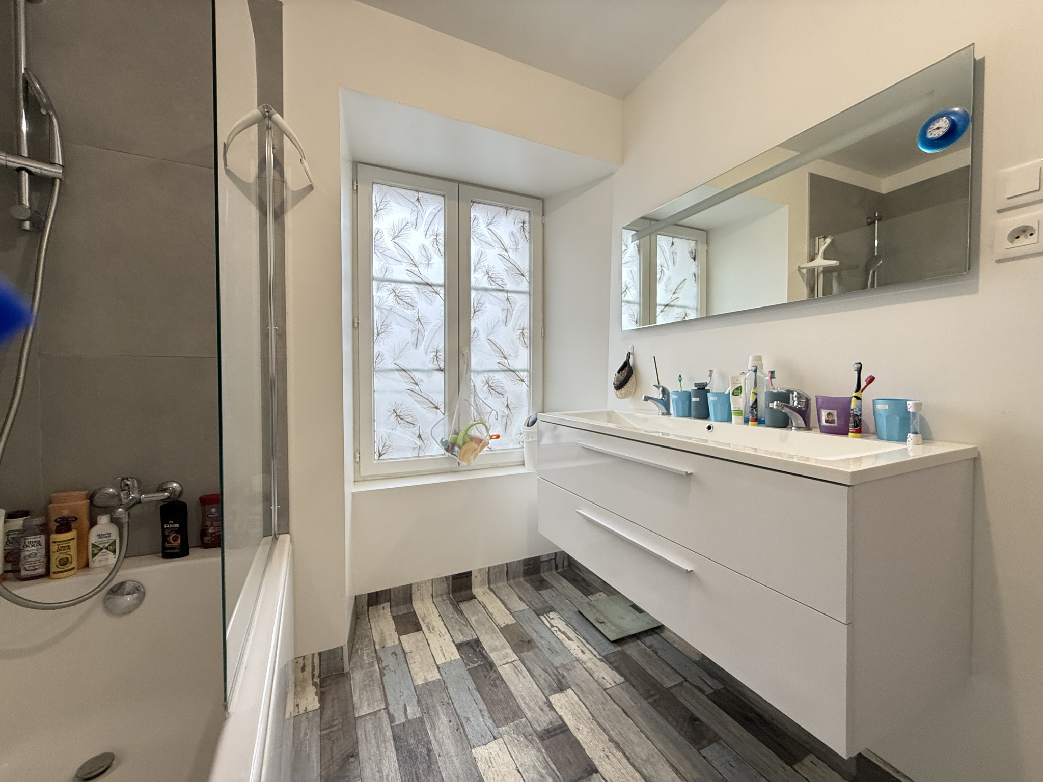 Le premier étage propose un palier desservant une chambre de 11,57 m², un WC indépendant et une salle de bain d’une belle superficie (6,26 m²). La ventilation est assurée par un système simple flux, avec VMC dans les pièces d’eau.