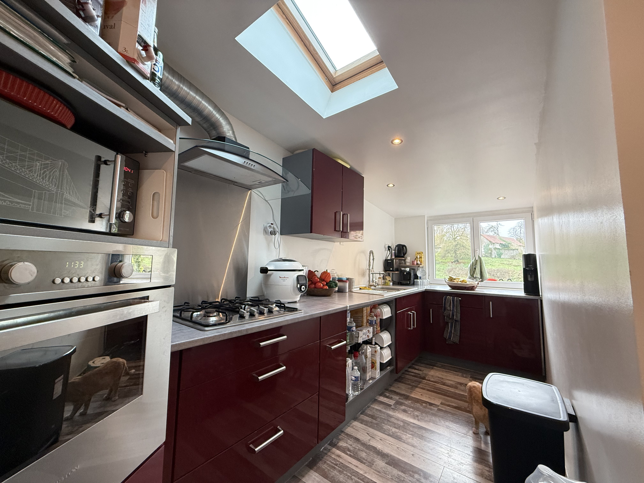 Au rez-de-chaussée, vous découvrirez un salon-séjour lumineux d’environ 29 m², exposé Est/Nord, ouvert sur une cuisine aménagée et équipée de 10,19 m² en très bon état.